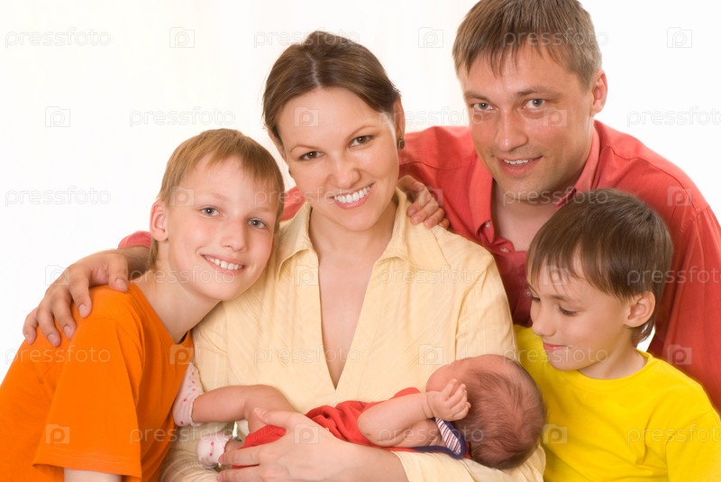 Портрет счастливой семейной пары с тремя детьми на белом фоне