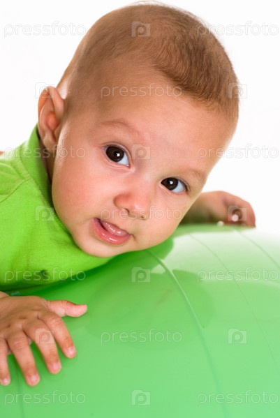 Малыш с фитболом на белом фоне
