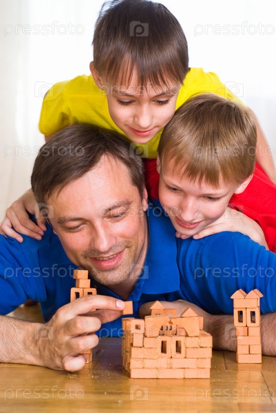 Отец с детьми играет на полу