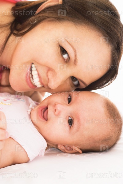 Мать с новорожденным ребенком на белом фоне