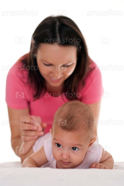 Мать с новорожденным ребенком на белом фоне