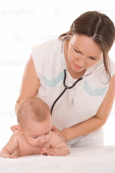Доктор с новорожденным ребенком на белом фоне