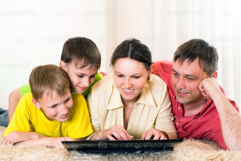 Счастливая семья, лежащая на ковре с ноутбуком