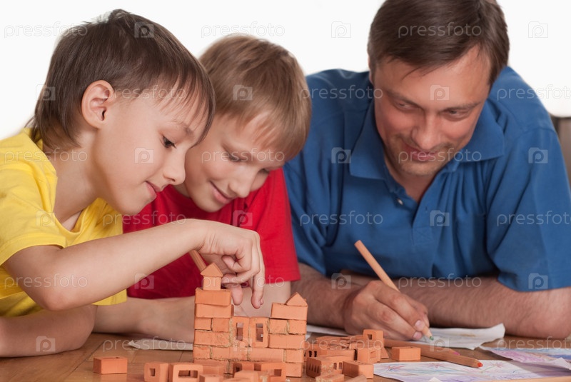Отец с детьми играет на полу