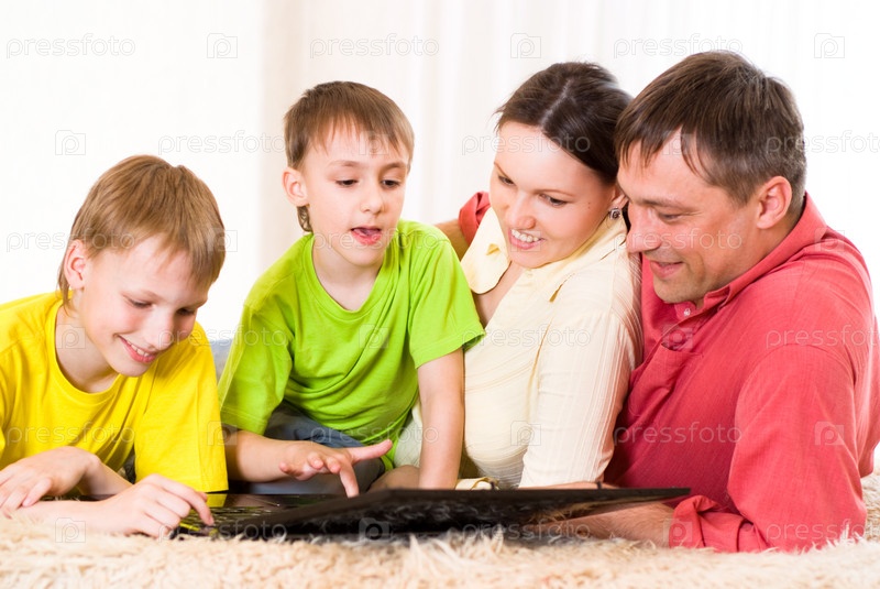 Счастливая семья, лежащая на ковре с ноутбуком
