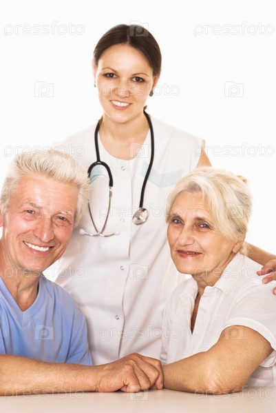Врач с пожилой парой на белом фоне