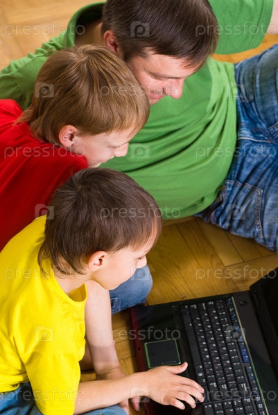 Отец с сыновьями смотрят ноутбук