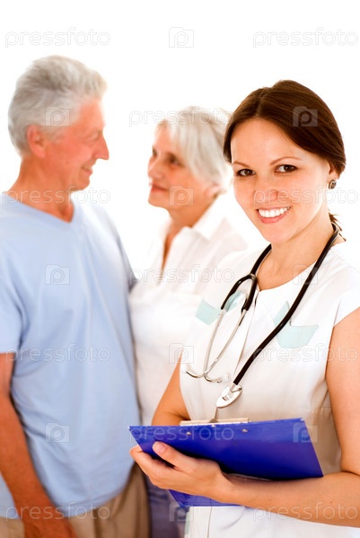 Врач с пожилой парой на белом фоне