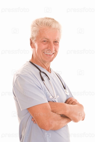 Пожилой врач на белом фоне