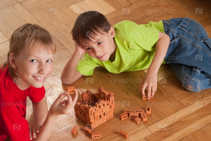 Счастливые братья, лежащие на полу с конструктором