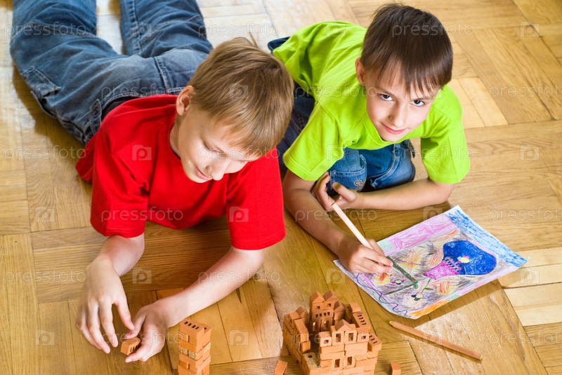 Счастливые братья, лежащие на полу с конструктором