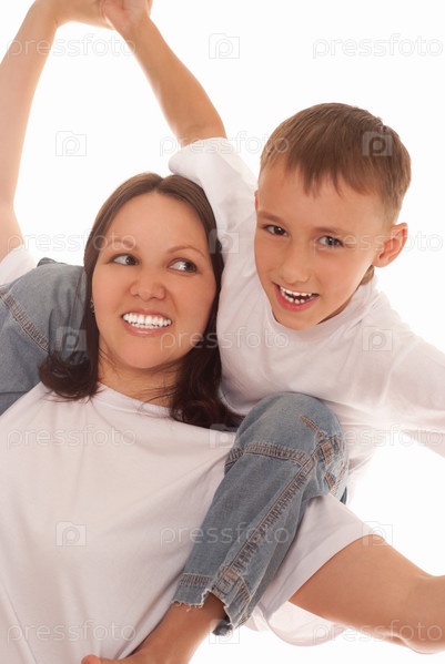 Счастливая мать с сыном на белом фоне