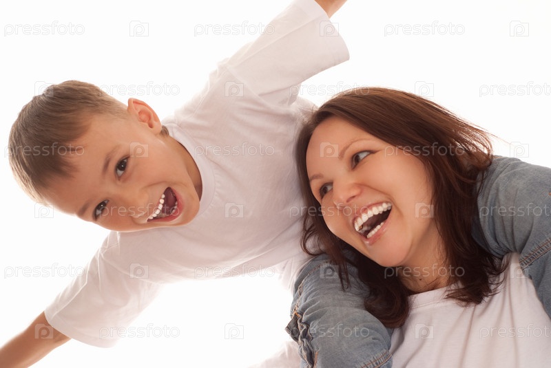 Счастливая мать с сыном на белом фоне