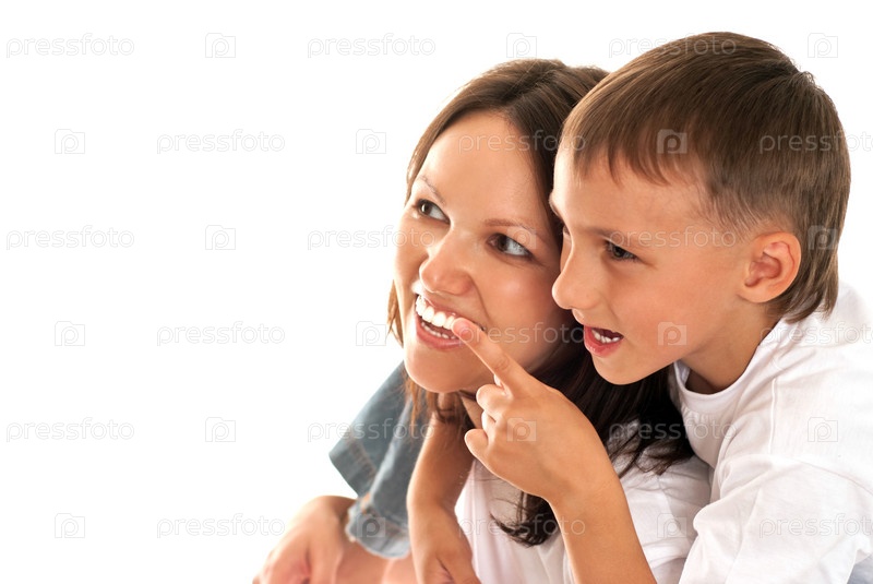 Счастливая мать с сыном на белом фоне