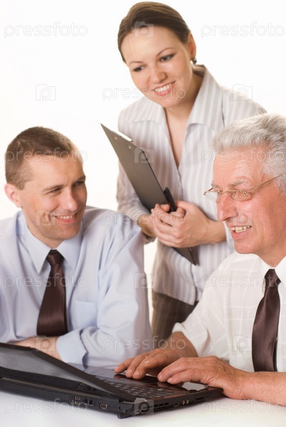 Бизнес-группа, работающая на ноутбуке на белом фоне