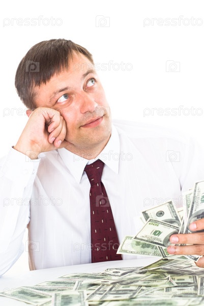 Мужчина с кучей денег, на белом фоне