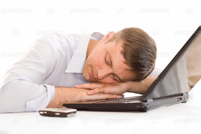 Мужчина с закрытыми глазами рядом с ноутбуком, на белом фоне