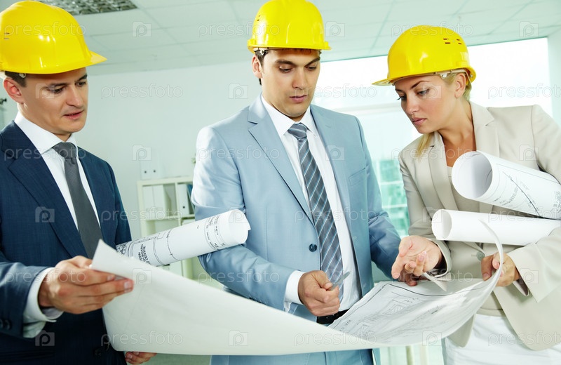 Инженеры в строительных касках обсуждают проект
