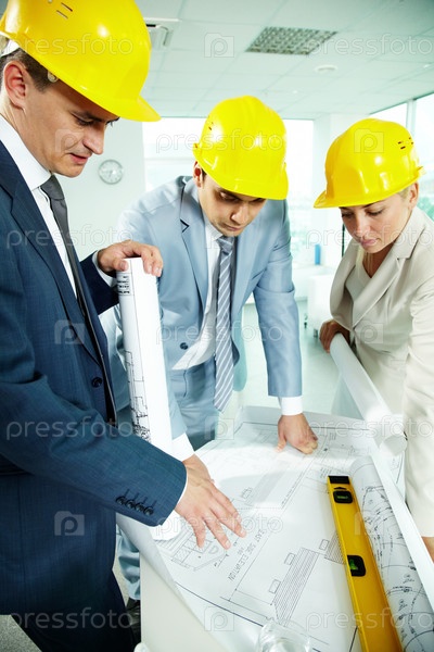 Инженеры в строительных касках обсуждают проект