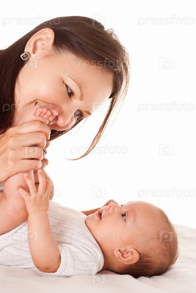 Счастливая мама целует новорожденного ребенка