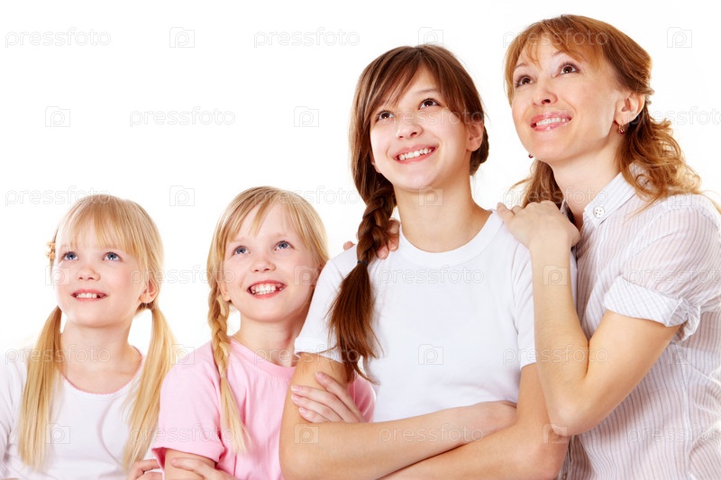 Счастливая мать с тремя дочерьми на белом фоне