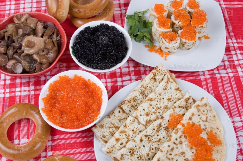 Блинчики с красной и черной икрой. Русский праздничный стол на Масленицу