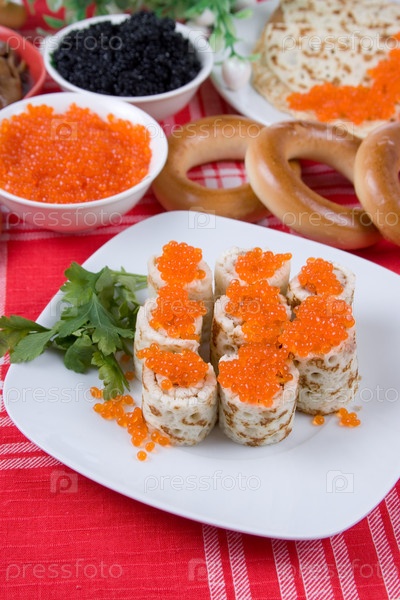 Блинчики с красной и черной икрой. Русский праздничный стол на Масленицу