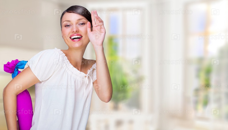 Молодая красивая женщина с бутылкой вина в упаковке крупным планом