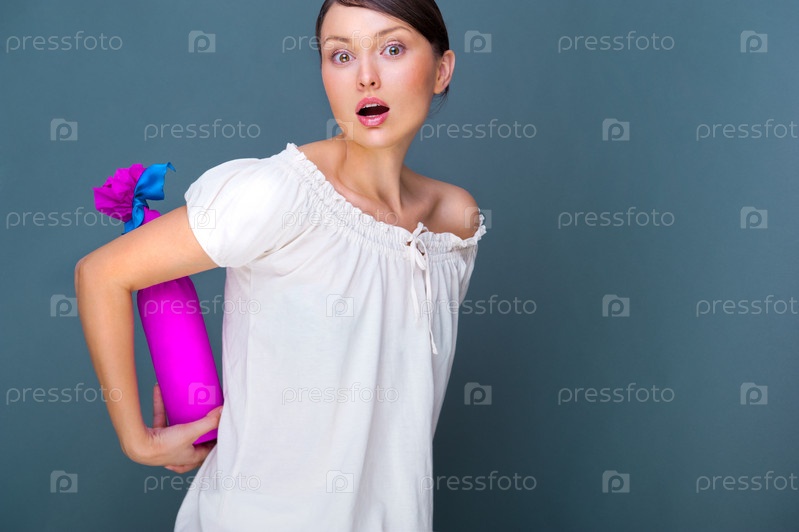 Удивленная красивая женщина с бутылкой вина в упаковке крупным планом