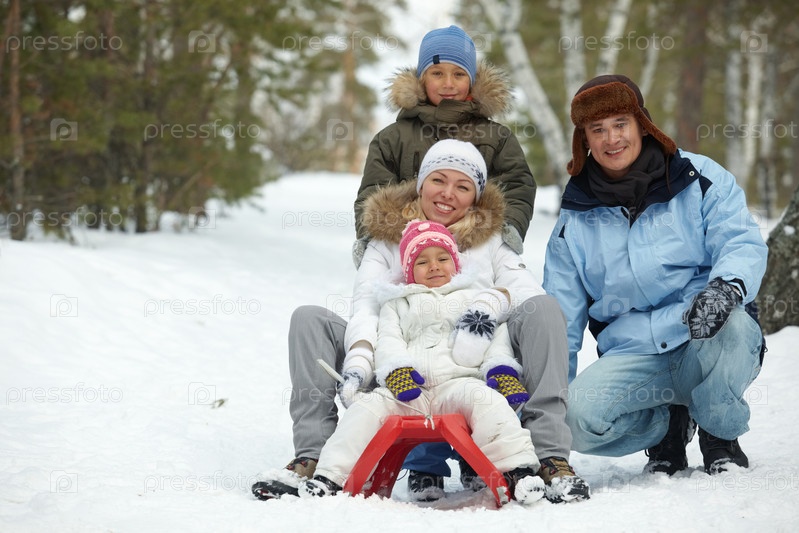 Семья отдыхает зимой в парке