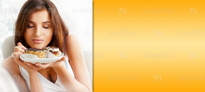 Молодая красивая женщина с десертом и место для текста