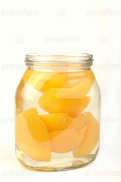 Консервированные персики в стеклянной банке на белом фоне