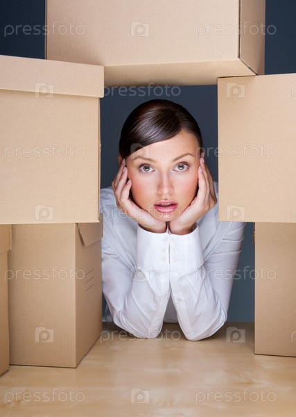Молодая красивая женщина среди коробок
