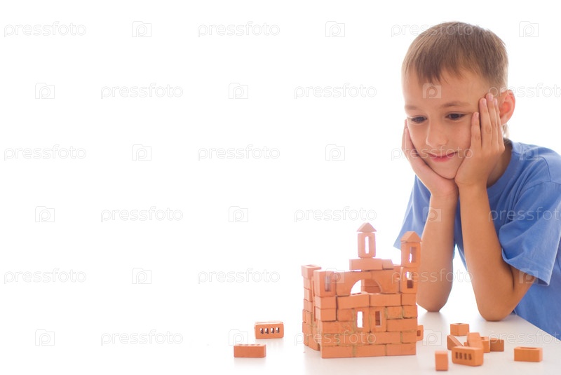 Красивый мальчик сидит за столом и думает