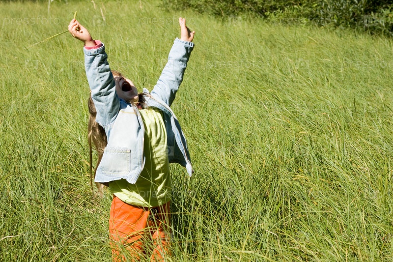 Портрет симпатичной девочки, стоящей в зеленой траве с поднятыми руками