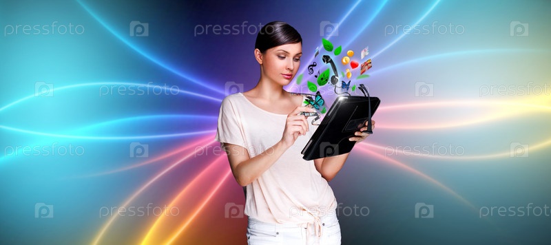 Молодая красивая женщина с планшетным компьютером на ярком фоне