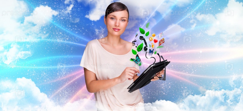 Молодая красивая женщина с планшетным компьютером на фоне неба
