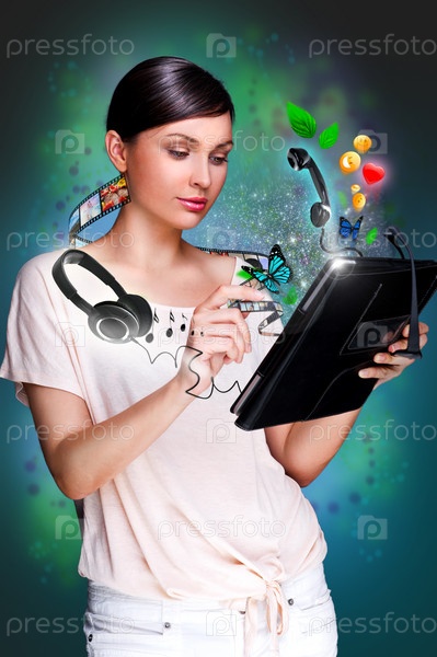 Молодая красивая женщина с планшетным компьютером на темном фоне
