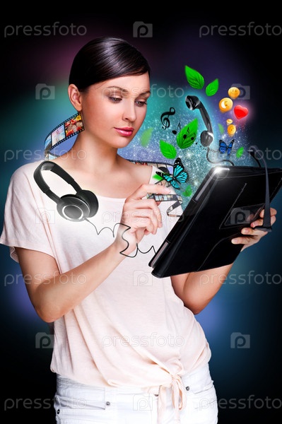 Молодая красивая женщина с планшетным компьютером