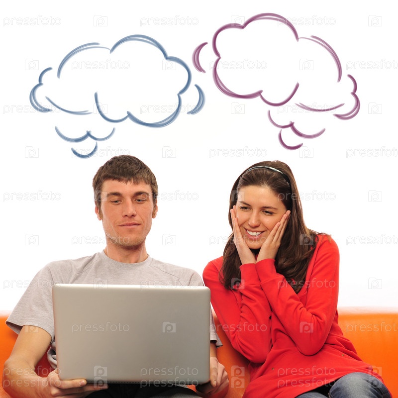 Молодая мечтающая пара с ноутбуком