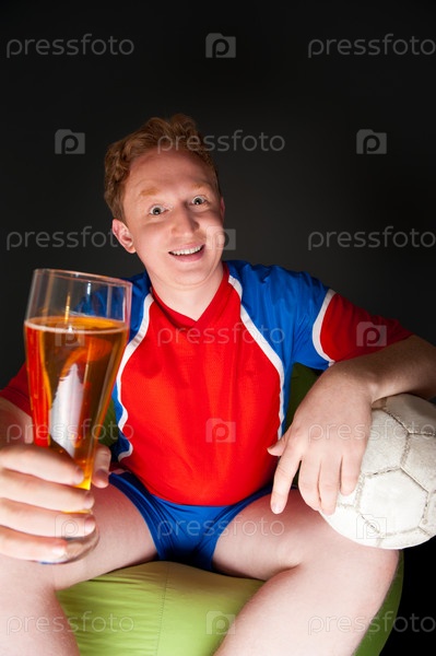Довольный футбольный болельщик с пивом и мячом на черном фоне
