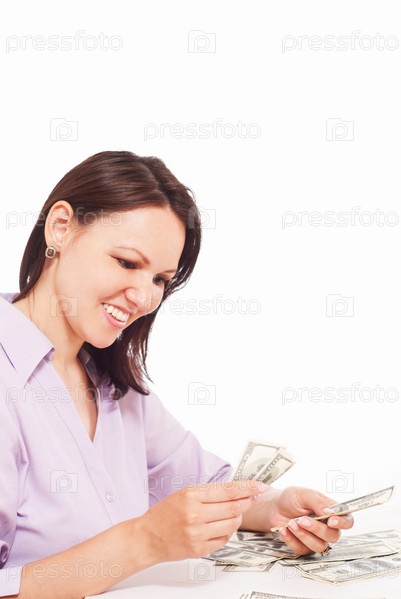 Улыбающаяся девушка считает деньги, на белом фоне