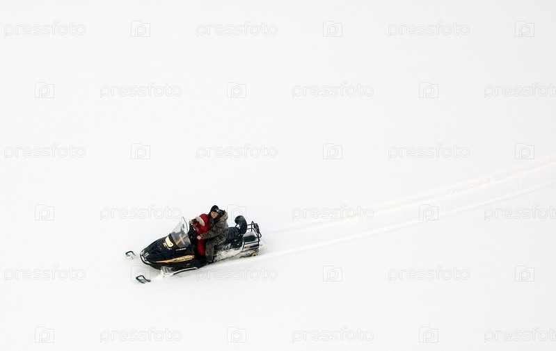 Люди на снегоходе, вид сверху