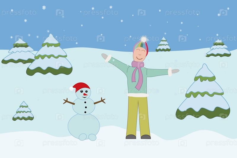 Парень со снеговиком в лесу, рисунок