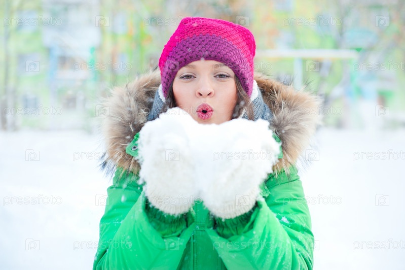 Девушка сдувает снежинки в зимнем парке
