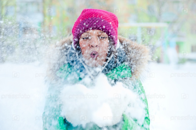 Девушка сдувает снежинки с ладоней в зимнем парке