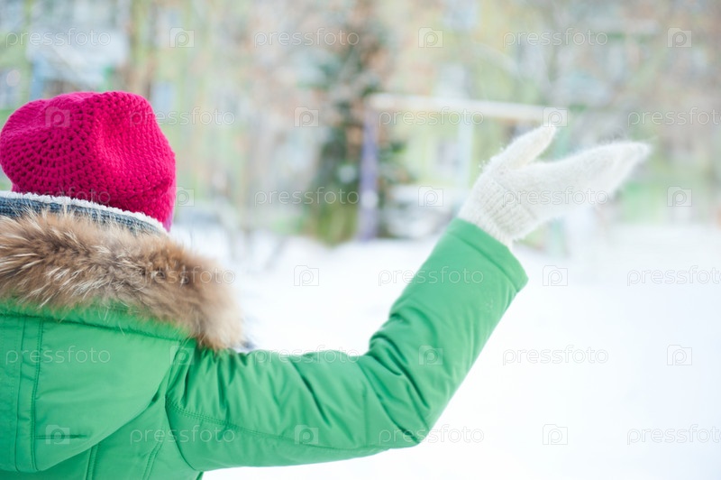 Девушка играет в снежки, вид сзади