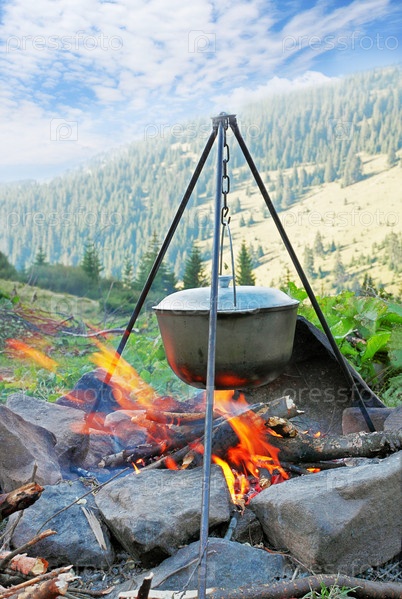 Приготовление пищи в котле на костре