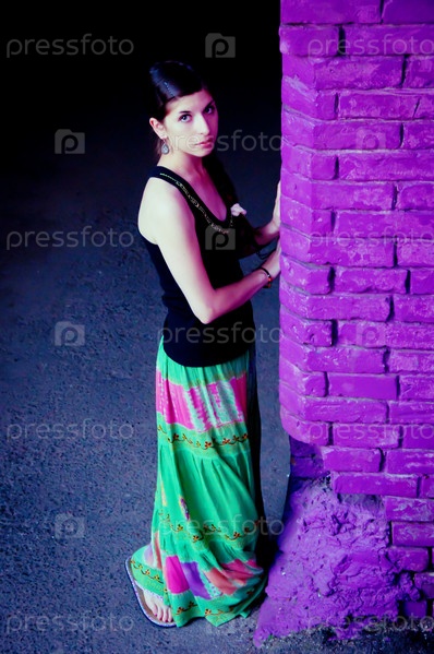 Девушка в длинной юбке, стоящая рядом кирпичной стеной