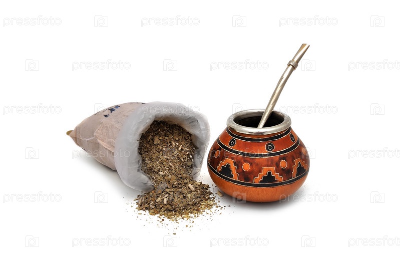 Сухие листья мате, калабас и фильтр на белом фоне